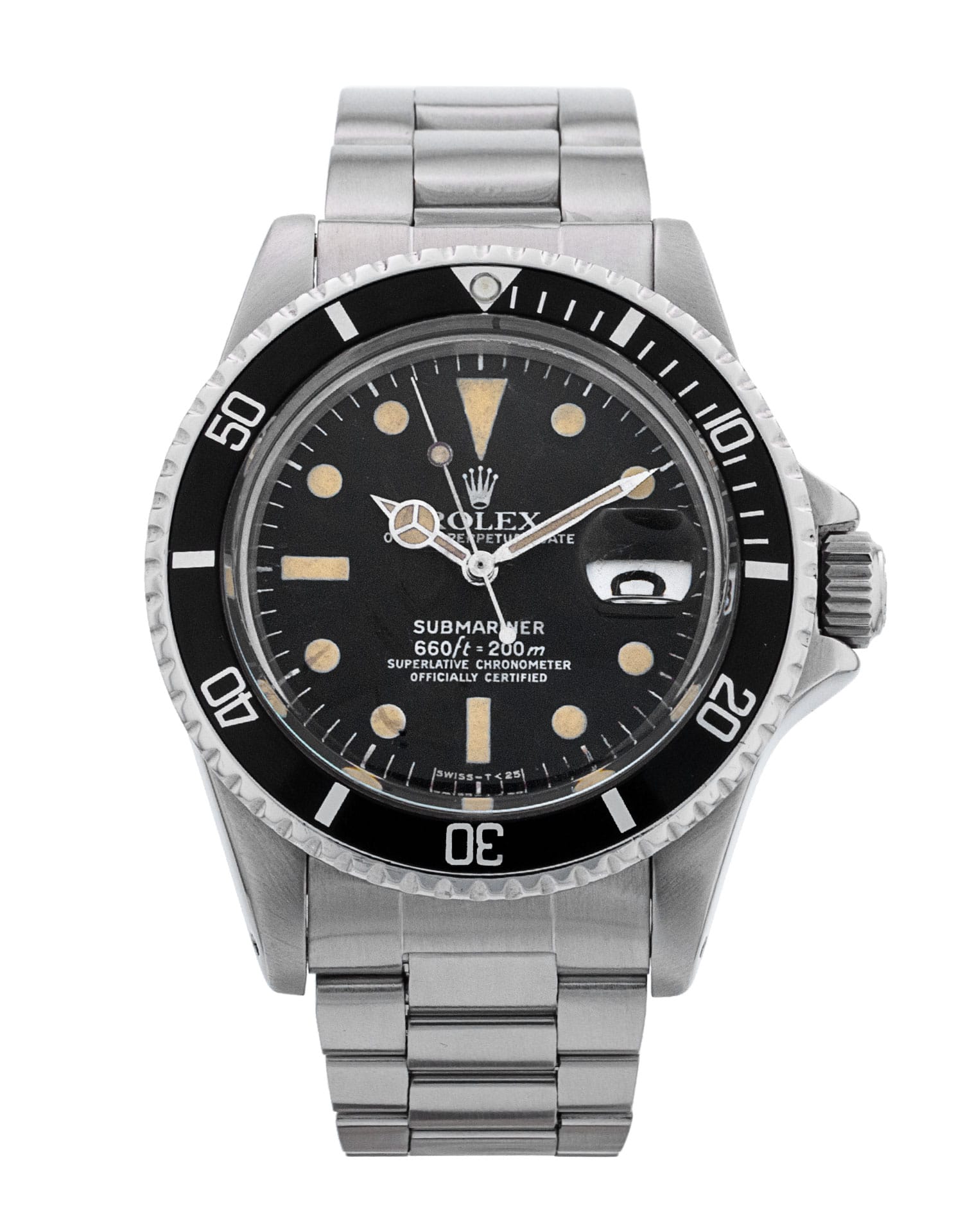 This Rolex Submariner 1680 has a black dial and a bracelet strap. This Rolex has undergone a thorough inspection of water resistance, accuracy, functionality and condition to determine the level of reconditioning required to meet our strict standards. It has also been referenced against technical documents and manufacturer records where available to ensure authenticity and a clean history. All our watches have a 24-month warranty for your peace of mind. One of our skilled polishing technicians has removed marks on the case and bracelet of this watch, brought about by daily wear and tear, which is why this watch does not come with the remaining manufacturer’s warranty.